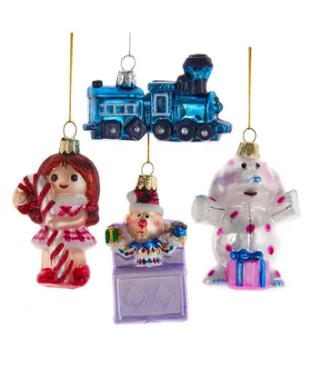 Complete your holiday décor or Christmas village with this Rudolph The Red Nose Reindeer® glass Misfit Toys assortment from Kurt Adler. This assortment includes A dolly for Sue, A spotted elephant, A train with square wheels on his caboose and A Charlie-in-the-box.