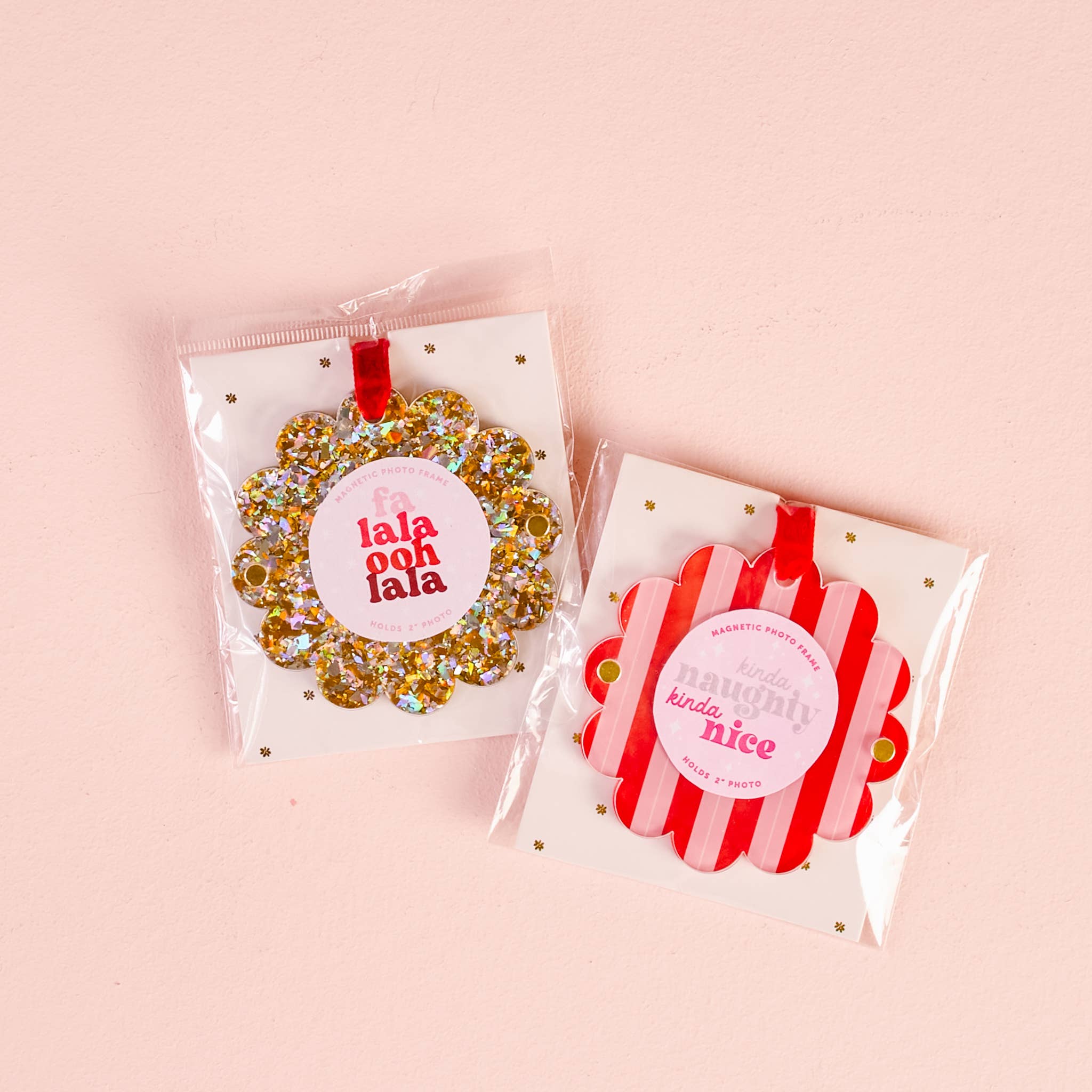 Add a personal touch to your holiday with our Scalloped Round Picture Frame Ornament! This modern hybrid design combines the charm of our festive acrylic ornaments with the function of our acrylic picture frames. A scalloped acrylic edge gives it a sleek, playful look, while the magnetic panels let you easily swap in your favorite 2" round photo. Hang it on your tree or tie it to a gift using the included ribbon. Packaged in a clear, hangable sleeve—it's perfect for gifting or collecting. modern, sleek design with charming scalloped edge includes a ribbon to display on your tree or to adorn a gift magnetic panels make swapping out your favorite mini photos a breeze packaged in a hangable clear sleeve holds 2" round photo dims: 3.5" diameter
