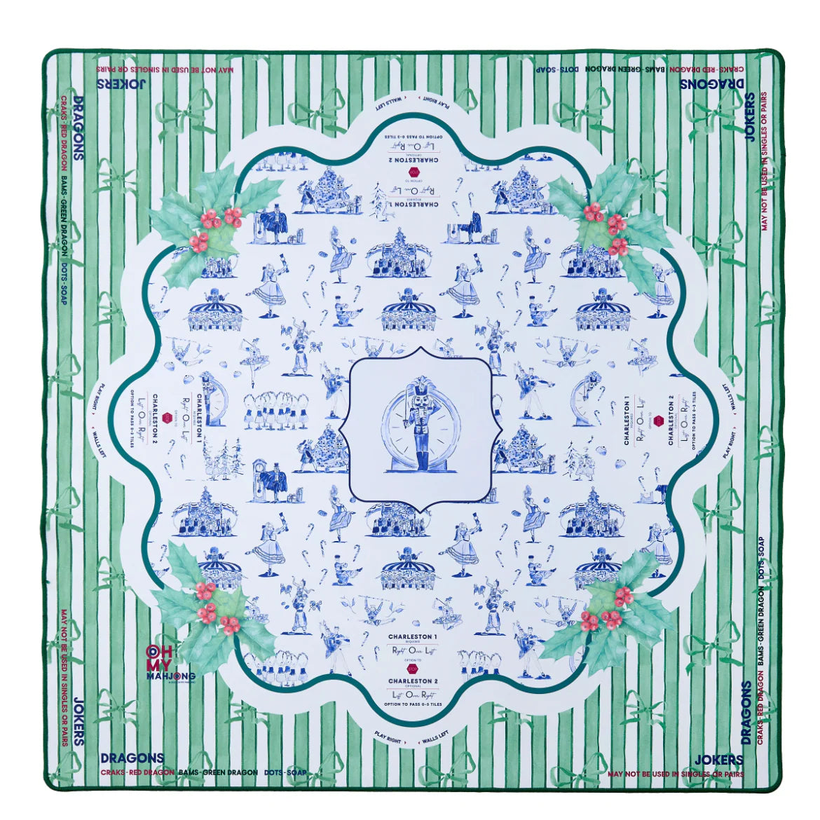Step into a snowy dreamscape with the Twilight Waltz Mat, a magical holiday collaboration with Fort Worth-based watercolor artist Catherine Cartie. Inspired by the timeless charm of The Nutcracker ballet, this mat captures the elegance and enchantment of the season with swirling dancers, festive flourishes, and delicate nods to the classic tale. Complete with wintry shades of blue and white with cheerful pops of green and red, the Twilight Waltz Mat brings storybook beauty and holiday sparkle to your Mahjong table.