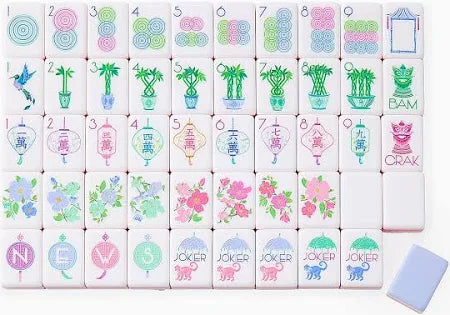 What's included: Tiles, a Dice/Coin Bag, and 4 Instructional Cards (you must purchase the NMJL Playing Card separately if you play American Mahjong).