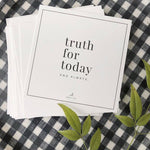 Fill your mind with beauty and truth everyday with this set of 31 Truth for Today scripture verse cards. Display in your home for a pretty way to point to Jesus. Use them as daily or weekly memory verse reminders. Share them as encouragement with a friend. Easily used as gift tags, bookmarks and more! Details: - 31 card set - 4" x 4" square - 120lb cotton eggshell textured paper - Envelopes and card stand sold separately - Original watercolor artwork by Emily Lex