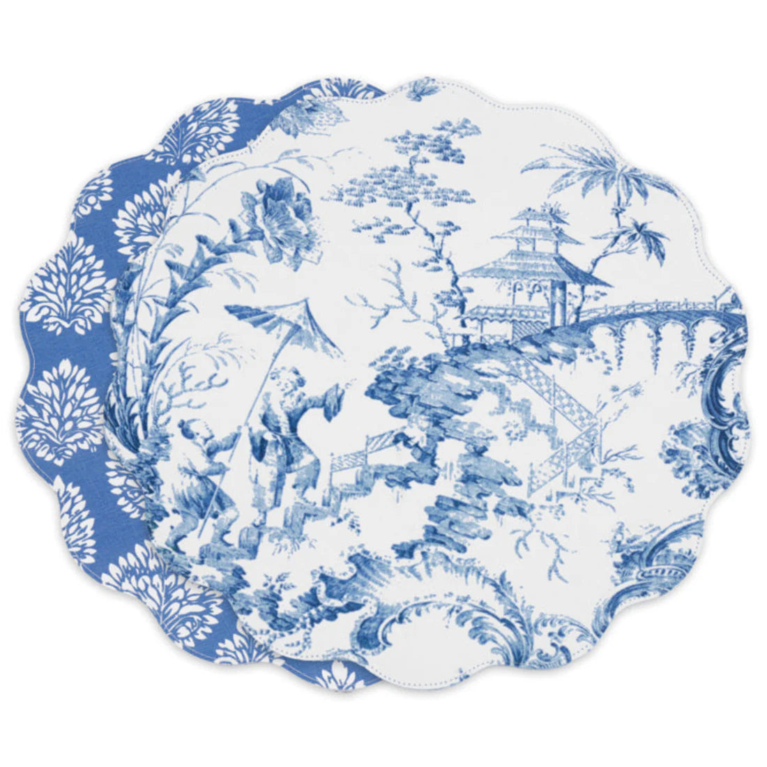 Double the style, double the fun! The VIDA Chinoiserie Reversible Round Placemat Set in blue and white gives you two looks in one. One side shows off a timeless Chinoiserie design with figures, foliage, and a pagoda, while the flip side brings a chic floral pattern in classic blue and white. With their leather-like feel and linen texture, these durable placemats add instant charm and an upscale look to any table. Sold in sets of four, they’re generously sized, easy to clean with just soap and water, and made exclusively for Beatriz Ball. Stylish, practical, and oh-so-versatile!