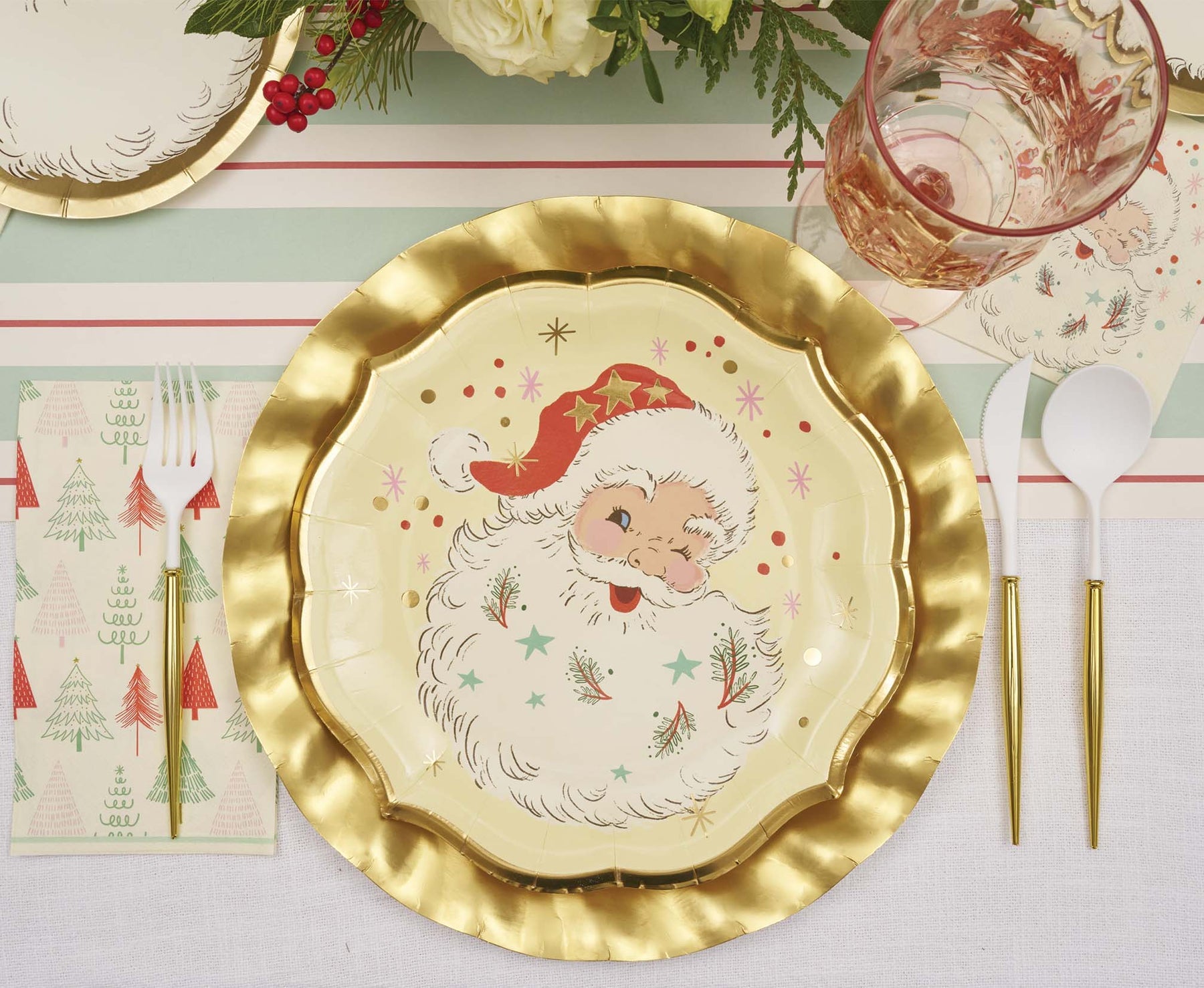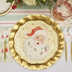 These scalloped-edge Vintage Santa dinner plates feature a stunning metallic gold trim and are the perfect touch of sophistication for any Christmas party. These plates are both durable and disposable, allowing you to skip the dirty dishes, without sacrificing quality and style. Your guests will never believe they’re disposable!