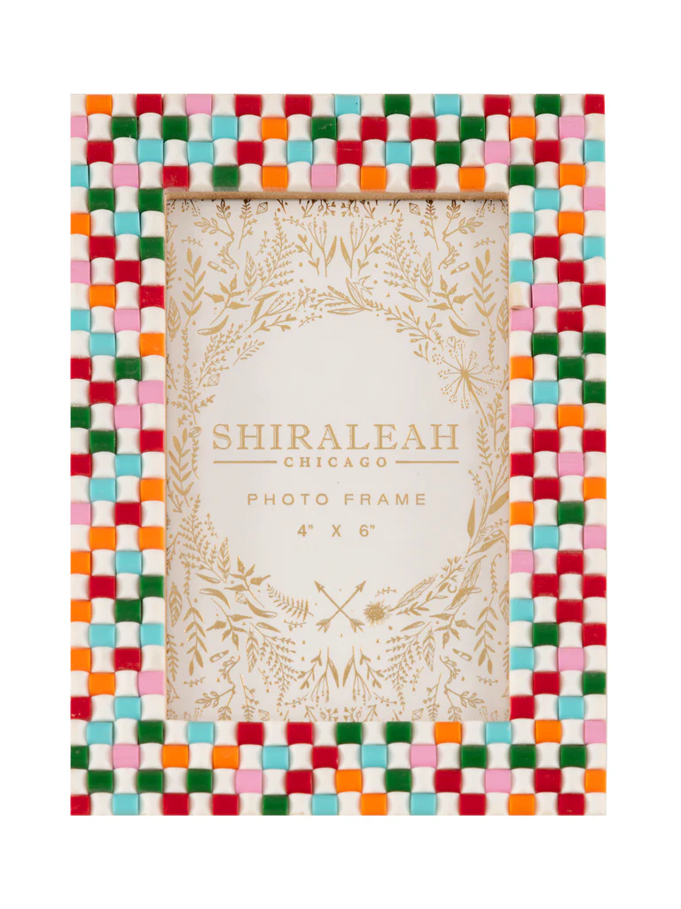 Put your favorite memories on display with Shiraleah’s Viva Mosaic Picture Frame. This 4" x 6" frame features a trendy checkerboard pattern in pink, red, orange, green, blue, and white, adding a colorful flair to your table top décor. The easel back stand allows the frame to sit easily on any flat surface display with a strong glass barrier to protect your artwork. Mix and match with other Shiraleah picture frames to complete your home gallery's look!